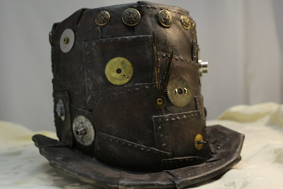 This is my steam punk top hat. at its core is made of yoga mat then covered in detailed craft foam. The rivets were epoxy.