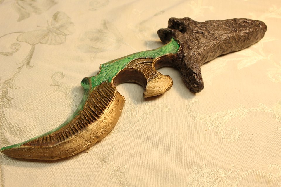 This a prop Dagger I designed based on the movie Epic. It was carved out of EVA foam, the handle was paper mache toilette paper and a wood glue wash.